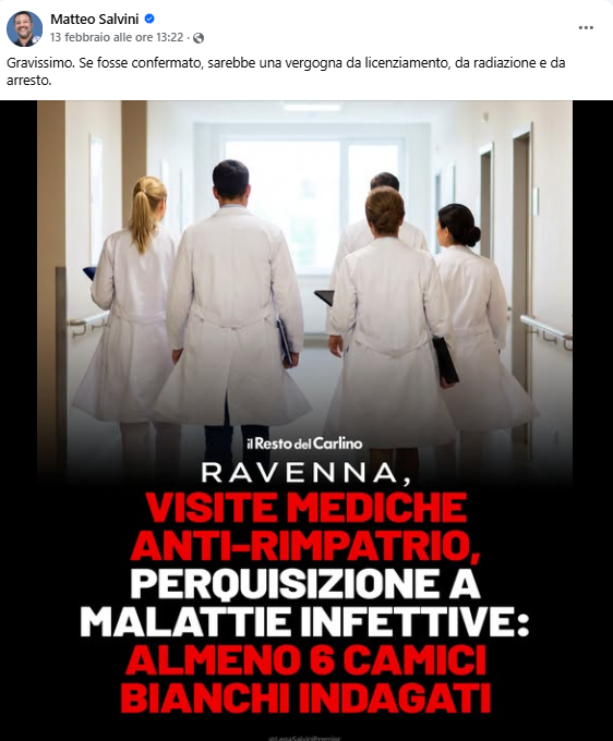 “Tutta la comunità medica dell’Emilia-Romagna è profondamente scossa dall’indagine aperta dalla Procura di Ravenna, nei confronti di sei medici del reparto di Malattie Infettive dell’Ospedale di Ravenna. Per quasi 9 anni sono stato Sindaco della città, compresi gli anni del Covid, conosco uno per uno i reparti e i volti di quell’ospedale e so bene quali sentimenti stanno attraversando i professionisti e le professioniste del Santa Maria delle Croci. A ciascuno di loro va il mio abbraccio e la vicinanza piena della Regione Emilia-Romagna”. Così il presidente della Regione, Michele de Pascale, sulla vicenda che vede coinvolti alcuni dirigenti medici del reparto di Malattie infettive di Ravenna, accusati di avere emesso falsi certificati, dichiarando l’inidoneità, per impedire che gli stranieri irregolari, sottoposti a visita, venissero accompagnati nei Centri di permanenza per il rimpatrio, pur in mancanza delle specifiche previste dalla legge (malattie infettive contagiose, disturbi psichiatrici, malattie acute…).