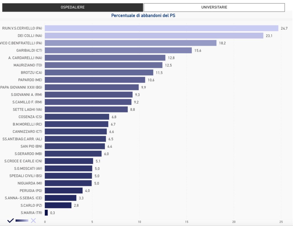 Tra gli ospedali universitari, la situazione è altrettanto variabile. Il pronto soccorso con il tasso più alto è il Giaccone di Palermo, dove gli abbandoni raggiungono il 18,8%. Seguono: