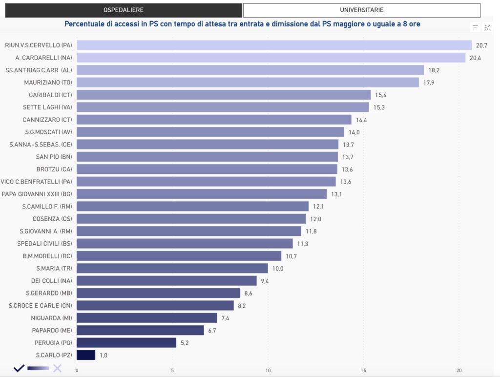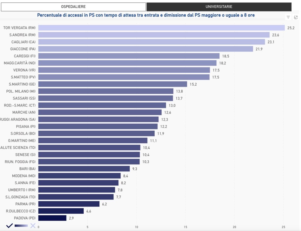 Il quadro degli ospedali universitari è dominato dal dato di Tor Vergata, che raggiunge il 25,2% di pazienti con permanenza oltre le 8 ore, il valore più alto in assoluto tra tutte le strutture considerate.