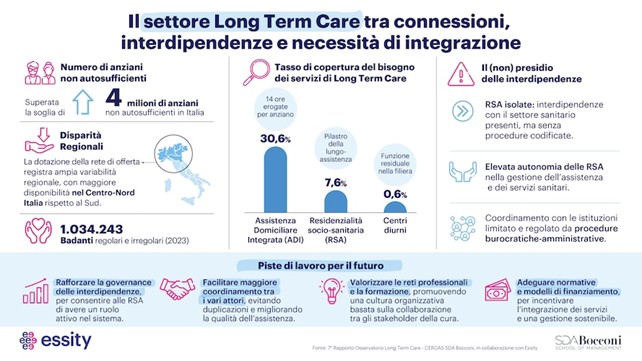 L’Italia si trova oggi davanti a un passaggio cruciale nella storia del proprio sistema di welfare e sanitario. L’invecchiamento della popolazione e l’esplosione della domanda di assistenza di lungo periodo non rappresentano più un futuro possibile, ma una condizione già presente. Nel 2025, gli over 65 sono il 24,7% della popolazione e diventeranno il 37% nel 2050; la fascia sopra gli 80 anni raggiungerà il 15%, la seconda più alta al mondo. Quasi il 60% delle persone oltre 75 anni dichiara limitazioni funzionali, e più di 4,1 milioni di anziani vivono soli.